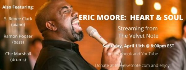 Let us bring date night from our living room to yours! Singer/Actor Eric Moore and his band perform his favorite songs, including music by Donnie Hathaway and Charlie Wilson and many more! Starring Eric Moore (vocals), S. Renee Clark (keys), Ramon Pooser (bass) and Che Marshall (drums). Ready to stream? Click HERE.