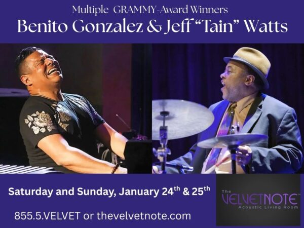 SATURDAY SHOWTIMES: 7:30PM & 9:30PM. SUNDAY SHOWTIMES: 6:30PM & 8:30PMThe Velvet Note is honored to welcome two giants of modern jazz—Benito Gonzalez and Jeff “Tain” Watts—for a rare, electrifying two-night engagement on January 24th and 25th. GRAMMY-winning pianist Benito Gonzalez brings his signature blend of fiery virtuosity, deep swing, and soulful lyricism, while legendary GRAMMY-Winning drummer Jeff “Tain” Watts—renowned for his explosive power, precision, and tenure with icons like Wynton Marsalis and Branford Marsalis—anchors the music with unmistakable authority. Together, they promise an evening of jazz at its highest level: bold, intimate, and alive in the moment.