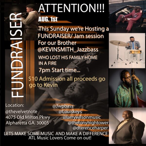 This Sunday, Musicians from all over Atlanta gather to raise money for GRAMMY-winning bassist Kevin Smith, who recently lost his home and belongings to a house fire. All door entry proceeds (paid at door) or donations go to Kevin. Feel free to stop by for a little or a lot, and be sure to donate to Kevin’s GoFundMe campaign HERE.