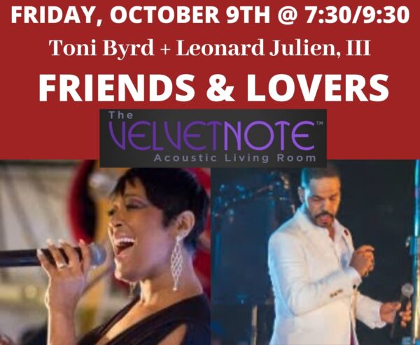 Toni Byrd and Leonard Julien are incredible long-time friends with playful, humorous chemistry! Their special brand of chemistry flows through each song they sing, and they can both sing…no, they can SANG. We are so proud to welcome them to the stage of The Velvet Note, sharing vocals and instrumentals and entertaining you and your friend…no, your lover…well…you don’t have to be one or the other. Either way, bring your person and come out and join us!